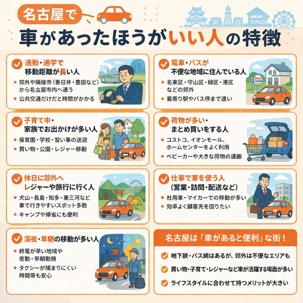 このように、名古屋では「車が必要か不要か」を一律で決めることはできません。自分の生活スタイルに合っているかどうかがすべてです。